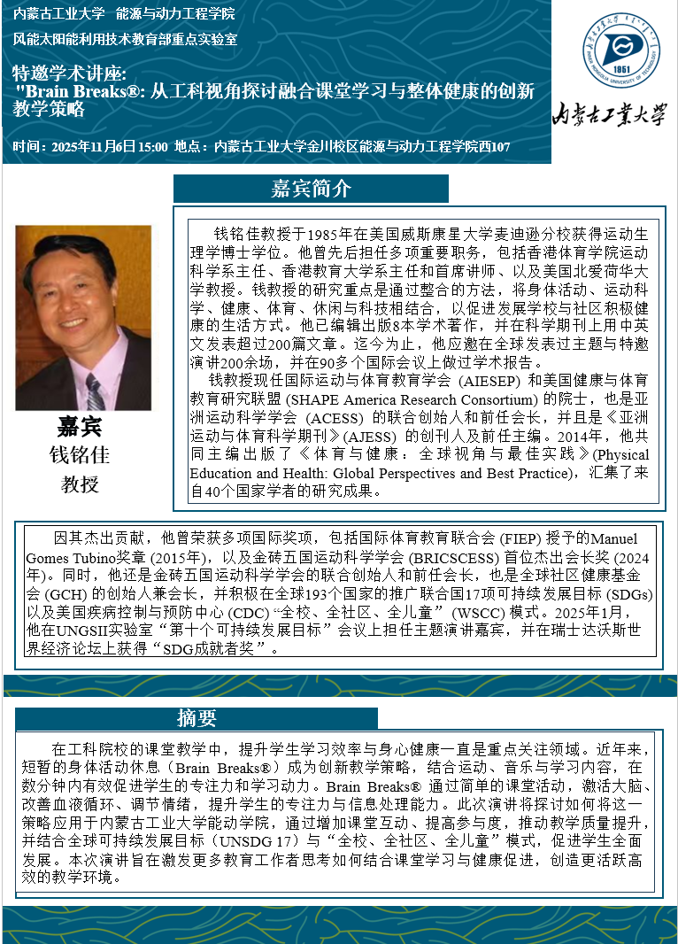 长期以来,工科院校学生往往更专注于技术成果与专业技能的提升。面对高强度的学业压力,如何科学调节身心、保持高效学习状态。为帮助学生应对这一挑战,能源与动力工程学院开展了针对性的引导工作。以此为主题,一场题为“Brain Breaks®从工科视角探讨融合课堂学习与整体健康的创新教学策略”的专题讲座于2025年11月6日在内蒙古工业大学能动学院西107会议室举办,。为师生带来了全新的解题思路。